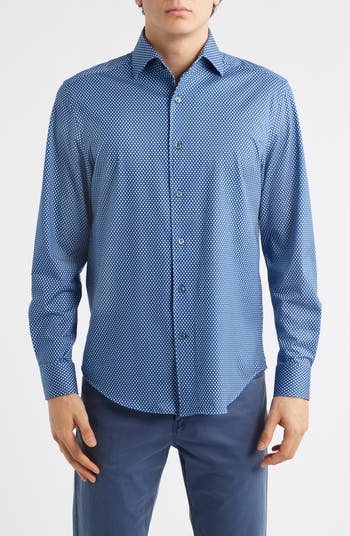 A geometric 3D honeycomb print styles a smart sport shirt cut from smooth, stretchy, wrinkle-resistant OoohCotton fabric designed to wick moisture, dry quickly and keep you comfortable all day.