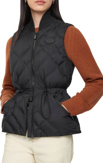 The lightweight, water-resistant nylon vest is quilted in a stitch inspired by the iconic Burberry Check, while an Equestrian Knight Design leather patch adds another element of signature branding. A wool-blend sweater-knit collar adds a polished touch, while a drawcord-toggle waist allows you to give the style a peplum shape.