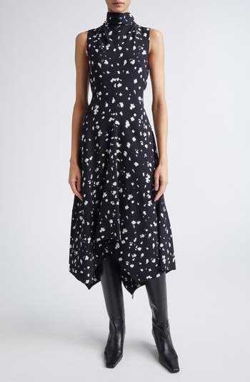 A gathered mock neck drapes down to a flowy viscose dress covered in an abstract but sophisticated print.