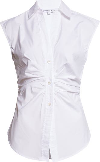 The classic poplin button-up is reimagined with playful cap sleeves and ruched side seams that softly nip in the silhouette.