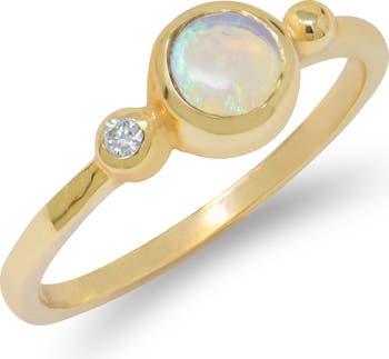 A bezel-set Australian opal and brilliant diamond sit side by side on this handmade ring shaped from hammered 14-karat gold.