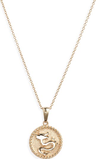 Signature dew drops halo an engraved dragon design on this handcrafted 14-karat-gold disc-pendant necklace that looks like an elegant artifact.