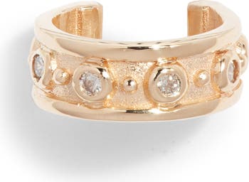 Bezel-set stones and beading evoke morning dew in this handmade ear cuff featuring an adjustable open silhouette.
