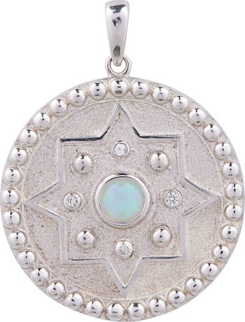 Signature dew drops join an opal cabochon on this handcrafted 14-karat-gold disc-pendant that looks like an elegant artifact.