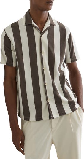 Wide cabana-inspired stripes against the stretch-enhanced fabric makes this camp shirt a getaway essential that'll see you stylishly from the pool deck to dinner at the resort.