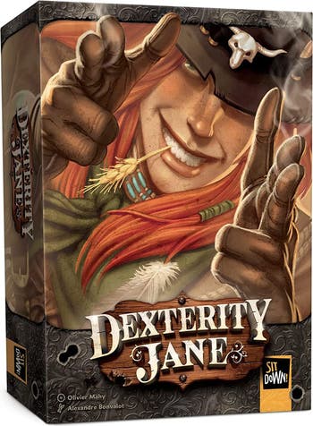 DEXTERITY JANE - HOW FAST CAN YOU FOLD YOUR FINGERS? Dexterity Jane has arrived in town. She walks into the saloon and sits down at a game table. In search of fame, some brave cowboys dare to challenge her and join her. The game begins and the hands are already flowing, the phalanges bend and unfold at a frantic pace. Cautious onlookers take a step back. The less resilient crack and fall apart, while Dexterity Jane seems numb to pain. This time again, she will leave victorious, crowned with unparalleled fame. Ages 8+, 2-9 Players, 20 Min.