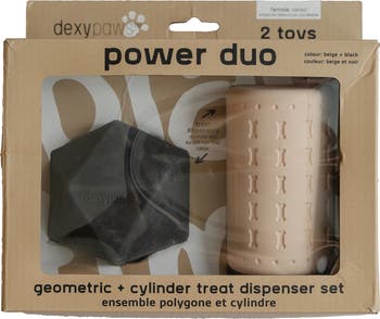 POWER DUO TOY SET: GEOMETRIC & CYLINDER - BEIGE & BLACK - Meet the Power Duo—the ultimate toy set for dogs who love to chew and stay engaged. Made from tough, durable rubber, these toys are built to withstand even the most powerful jaws, offering long-lasting play and satisfaction. The Geometric toy features unique ridges and grooves that not only provide a deeply satisfying chewing experience but also help support dental health. Paired with a cleverly designed treat dispenser, perfect for stuffing with snacks or peanut butter, this duo delivers mental stimulation and rewarding fun. It’s the perfect combination of strength, function, and entertainment for your power chewer! Designed to keep dogs mentally and physically active, this set helps reduce boredom and destructive behaviors by channeling energy into healthy play. Easy to clean and made from safe, non-toxic materials, it’s built for daily use and endless enjoyment. Whether used for solo chewing sessions or interactive play, the Power Duo is sure to become your dog’s favorite go-to toy.