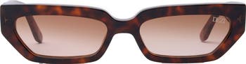 A slim rectangular silhouette lends trend-savvy appeal to striking sunglasses fitted with UV-protective lenses.