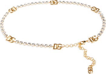 Interlocking logos are interspersed among light-catching crystals on a dainty chain belt that will perfectly accent your waist.