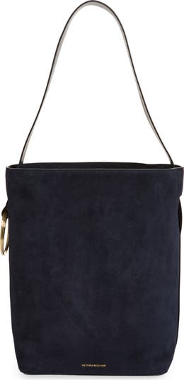 This sleek leather north/south bucket bag is designed with a minimalist aesthetic, accented with only a golden ring finishing off the strap.