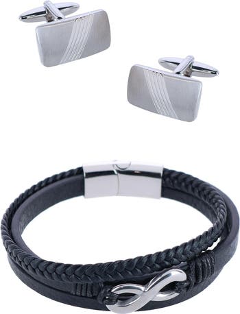 Diagonal Rhodium Cufflinks & Infinity Triple Band Leather Bracelet