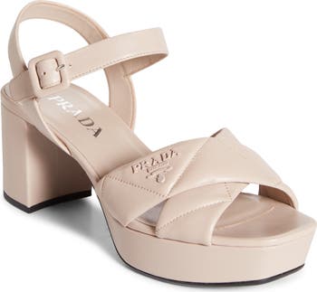 The emblematic triangle logo is reinterpreted in a quilted motif on this quarter-strap platform sandal set on a chunky heel and rendered in soft leather.