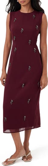 Seeveless dress in a midi silhouette with a crew neckline, diamanté and ribbon embellishment with a rear split and zip fastening through the back.