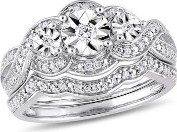 Mark your past, present, and future with the profound symbolism and elegant sparkle of this three-stone bridal set. Crafted in luminous sterling silver, the set includes an engagement ring and a perfectly matching wedding band. The engagement ring features three brilliant diamonds, representing the key chapters of your love story. This set delivers classic, unified beauty and is a cherished expression of your continuous and enduring commitment.