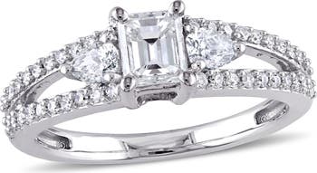 This amazing ring is made with emerald, pear and round-cut diamonds set in 14k white gold. The fashion styled ring glimmers with highly polished finish.