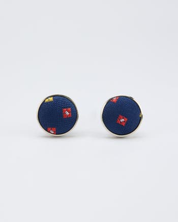 Hand-woven from pure silk and finished with polished copper, these cufflinks feature a scattered diamond motif reminiscent of delicate blossoms set against a deep navy base. Subtle pops of warm red and soft yellow add contrast and rhythm, bringing quiet character to the refined weave.