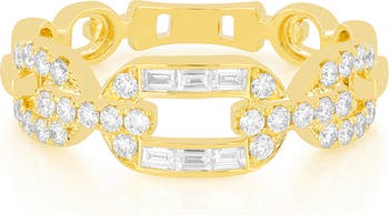 This 14-karat-gold ring features a chain silhouette lit up with round and baguette-cut diamonds.