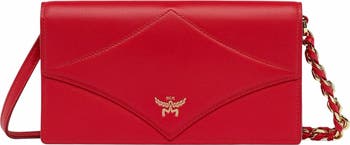 Calfskin leather wallet on chain with quilted Bavarian diamond pattern and MCM logo motif