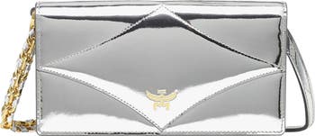 Metallic mirror leather wallet on chain with Bavarian diamond quilting and MCM logo motif