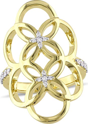 Elevate your jewelry collection with this ring that features a breathtaking display of light and glamour. Set in 18k yellow gold-plated sterling silver, its intricate design blooms across your finger with sophisticated luxury and radiant charm. This opulent piece is a gorgeous expression of style, delivering a brilliant, eye-catching sparkle that transforms every look into a masterpiece.