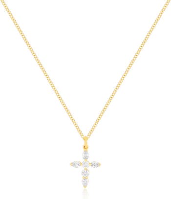 Wear your faith proudly above your heart in this stunning 14-karat yellow-gold necklace with a cross pendant gilttering with diamonds.