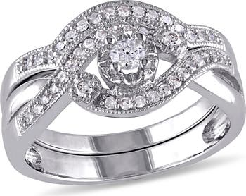 Celebrate your commitment with the fluid elegance and brilliant symbolism of this crossover bridal set. Crafted in luminous sterling silver, the set features an engagement ring and a wedding band that fit together beautifully. The design incorporates graceful, intertwining bands, symbolizing two paths merging into one unified journey. The diamonds provide a continuous stream of light, making this set a sophisticated and meaningful expression of your enduring love.