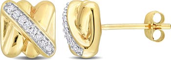 These stylish crossover design stud earrings are crafted in lustrous 14k gold and feature 16 round-cut, pave-set diamonds mounted on the top band of the crossover design. Enhanced with a polished finish, these exquisite earrings are secured with butterfly closures. A quick way to glam up for your next event.