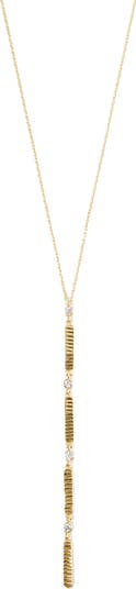 Diamond-cut bars and bezel-set cubic zirconia lend light-reflecting trickle to this sterling-silver Y-necklace plated in gleaming 18-karat gold.