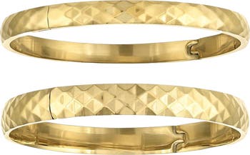 A lustrous update to the classic gold bangle, this waterproof set of two showcases a precision-cut, faceted finish that infuses an edgy allure into timeless sophistication.