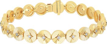 Radiating lines accent central diamonds in this disc bracelet gleaming in 14-karat gold.