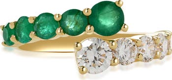 Glittering diamonds juxtaposed against stunning emeralds bring striking contrast to this sculptural bypass-style ring crafted from polished 14-karat yellow gold.
