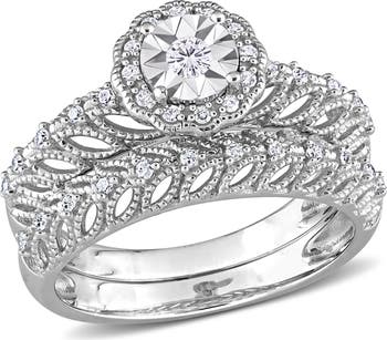 Celebrate your unique union with the striking geometry and brilliant sparkle of this bridal set. Crafted in luminous sterling silver, the set features a central diamond arrangement framed by an eye-catching octagon-shaped halo, offering a modern, distinctive edge. The wedding band contours perfectly with the engagement ring, symbolizing the seamless fit of your lives. This set delivers a captivating blend of classic radiance and contemporary style, perfect for an unforgettable commitment.