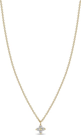 Four sparkling prong-set diamonds act as the petals of a flower blooming on a dainty pendant necklace crafted from timeless 14-karat yellow gold.