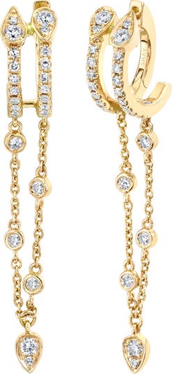Round-cut diamonds sparkle within bezel charms on these gold double-hoop earrings detailed with swingy looped chains.
