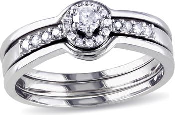 Begin your journey together with the magnificent radiance and unified design of this diamond halo bridal set. Crafted in luminous sterling silver, the set features a striking halo that surrounds the central diamonds, dramatically increasing their light and visual size. The wedding band is perfectly contoured to fit the engagement ring, symbolizing the seamless blending of your lives. This set offers a brilliant and timeless expression of enduring commitment and love.