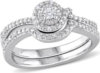 Celebrate your union with the magnificent sparkle and unified design of this elegant bridal set. Crafted in luminous sterling silver, the set features a striking halo that surrounds the central diamonds, dramatically increasing their light and presence. The wedding band is perfectly contoured to fit the engagement ring, symbolizing the seamless blending of your lives. This set offers a truly brilliant and timeless expression of enduring commitment and love.