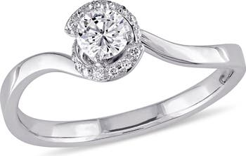 This beautiful swirl ring features a round-cut diamond center stone with round diamond side stones. The engagement ring is crafted of fine 14-karat white gold with a high polished finishing.