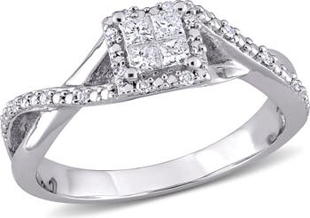 Declare your love with the intricate and brilliant design of this captivating engagement ring. Crafted in luminous sterling silver, the beautiful halo setting combines princess-cut and round diamonds for a rich, dynamic sparkle. The graceful, crisscrossing bands meet to symbolize two unique paths joining together forever. This piece delivers a magnificent, sophisticated presentation, making it a perfect, unforgettable symbol of lasting commitment.