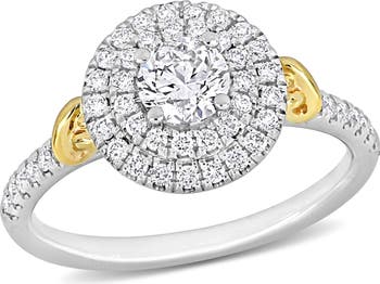 This beautiful two-tone halo ring is crafted in lustrous 14k white and yellow gold and features a central round-cut prong-set diamond and 48 round-cut buttercup-set diamonds in a multi-halo design extending halfway through the delicate band. Enhanced with a polished finish, this sophisticated ring is a lovely accessory for special occasions.