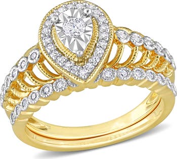Adorn your hand with the dramatic grace and warm brilliance of this teardrop bridal set. Crafted in luminous yellow silver, the set includes an engagement ring and a perfectly fitted wedding band. The design features a magnificent halo that traces the elegant, elongated silhouette of the central teardrop shape, maximizing the sparkle. This set offers a truly romantic and unique expression of your enduring love, beautifully combining classic radiance with a captivating form.