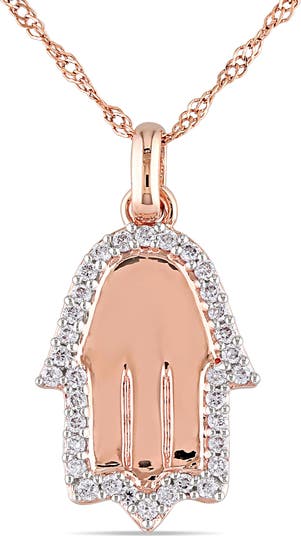 Embrace timeless symbolism with a modern touch. This elegant Hamsa pendant is crafted in radiant 14k rose gold and adorned with sparkling diamonds totaling 1/8 carat total weight. The Hamsa, a symbol of protection and good fortune, is beautifully accented with pavé-set diamonds that add just the right amount of shimmer. Suspended from a coordinating chain, this meaningful piece blends spirituality and style effortlessly.