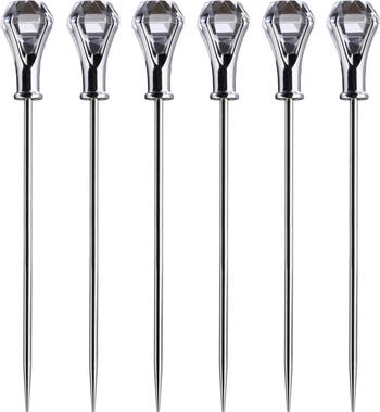 The Prodyne Diamond Head Martini Picks, Set of 6, bring style and sparkle to cocktails and appetizers. Each pick features a stainless steel shaft topped with a faceted acrylic diamond for an elegant look. Reusable, durable, and easy to clean, these picks are perfect for martinis, olives, and party garnishes.