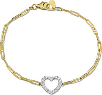 Show your love in style with this diamond heart bracelet in 14K two-tone gold. Sparkling diamonds accent delicate heart motifs, blending white and yellow gold for a timeless, romantic look. The 7-inch length offers a comfortable, elegant fit on the wrist. Perfect as a meaningful gift or a personal touch of luxury.