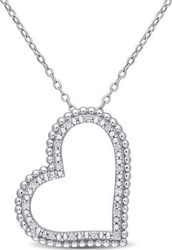 Show your love with this luxurious Diamond Heart Pendant Necklace. Crafted in lustrous sterling silver, this pendant features 17 round-cut, prong-set shimmering diamonds beautifully placed around the outline of the heart inside a row of beads. Enhanced with a high polish finish, this diamond pendant is suspended on an 18-inch cable chain that secures with a spring ring clasp.