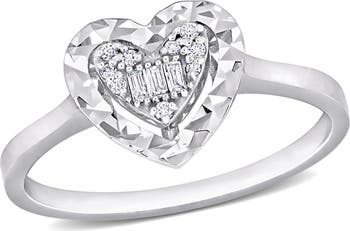 Enhance your style with our Diamond Accent Heart-Shape Cluster Ring in 14k White Gold. This stunning piece features a captivating design with parallel baguette-cut and round-cut diamonds meticulously set in a 14k white gold band. The combination of these sparkling stones creates a timeless and elegant look.