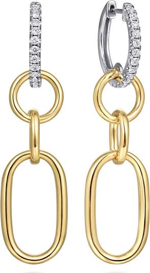 Diamond huggie hoops anchor 14-karat gold hollow loops in these two-tone drop earrings that exude geometric allure.