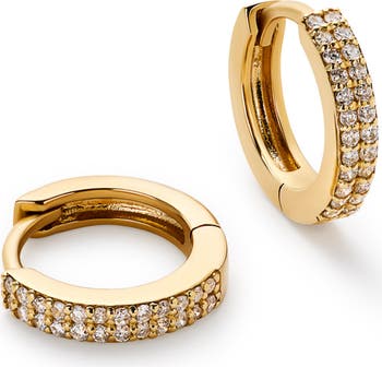 These diamond hoop earrings are proof that you can never wear too many diamonds. Crafted in recycled solid gold, these waterproof huggies feature a thick silhouette with two rows of radiant lab-grown diamonds. Create the perfect solid gold ear stack and style these huggies with our mini Gold Classic Hoops.