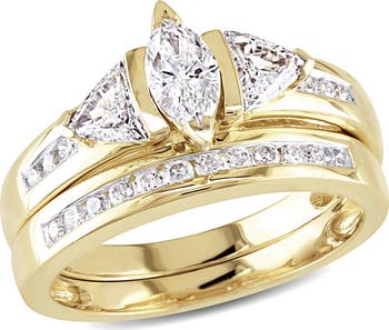 Exude modern sophistication with this channel-set marquise and trillion diamond bridal set. Its sparkling diamonds are elegantly arranged to create a bold, contemporary design that radiates elegance. Crafted in 14k yellow gold, the set highlights each stone’s brilliance while offering timeless, refined style. Perfect for celebrating love and cherished moments, it combines striking beauty with meaningful expression. With its unique design and lasting charm, this bridal set will be treasured for a lifetime.
