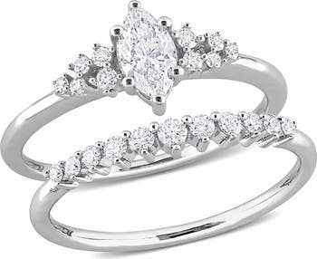 Celebrate enduring love with this marquise and round-cut diamond three-stone ring paired with a semi-eternity wedding band. Its sparkling diamonds create a sophisticated and timeless design that shines from every angle. Crafted in 14k white gold, the set highlights each stone’s brilliance while offering elegant, refined style. Perfect for marking cherished milestones, it combines emotional significance with classic beauty. With its graceful design and lasting appeal, this bridal set will be treasured for a lifetime.