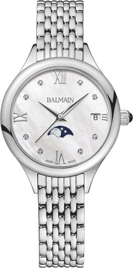 The moon and stars peek out from a mother-of-pearl dial marked with alternating Roman numeral and diamond indexes on a polished bracelet strap beaming with celestial style.